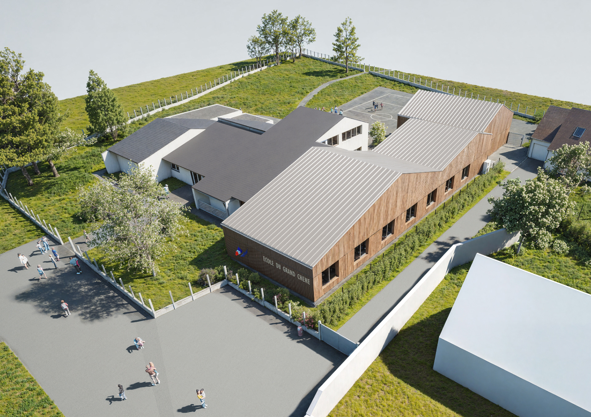 L’extension se greffera sur la partie est de l’école du Grand Chêne. Son expression architecturale est en continuité de l’organisation constructive existante. Elle s’appuie sur la trame des refends maçonnés en une succession de volumes à double pente, orientés nord/sud, faisant apparaître, en cœur, un patio paysager.