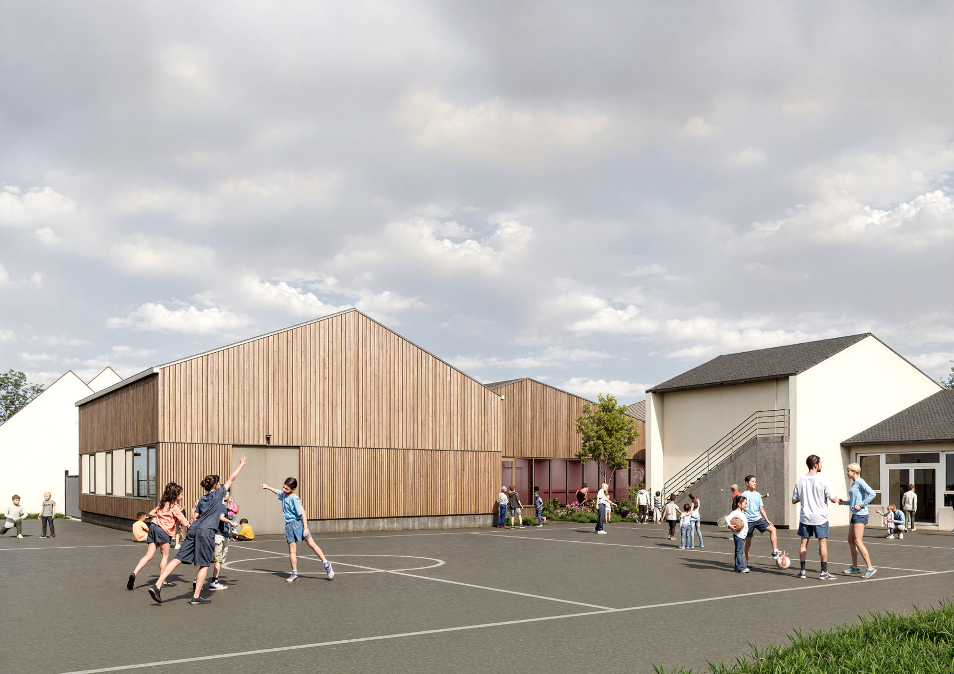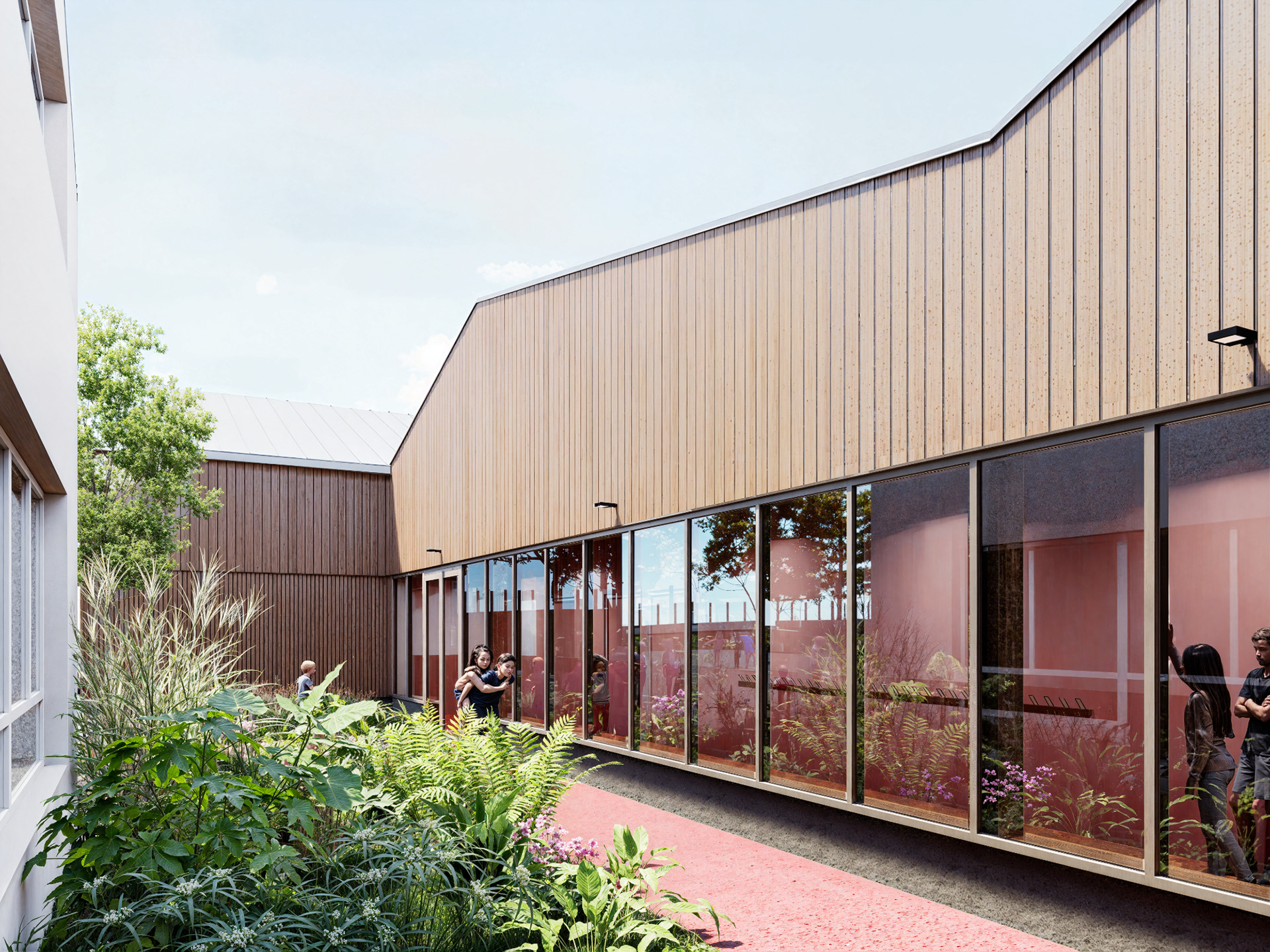 Cette respiration, garante d’apport de lumière naturelle, réduit l’impact visuel du projet tout en offrant une ponctuation végétale dans l’environnement bâti. Elle devient le cœur du flux de circulation en proposant un seul et unique accès à la cour de récréation.